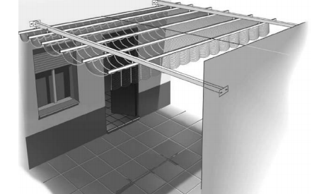 Como su nombre lo dice es una pérgola en la cual las guías se colocan de una pared a otra, con sus respectivos soportes anclados al frente de la pared o en el techo de la misma, por lo cual se elimina el coste de los pies o pilares, portería, etc… lo que supone un ahorro al comprar dicha pérgola, así mismo se puede elegir el perfil que más le guste para las guías.